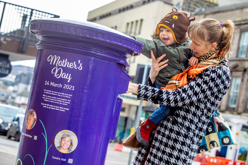 14th March 2021 | Robert Cole | Leave a comment Mothers are the latest group to be recognised and celebrate with specially decorated Royal Mail post boxes. Three of the four boxes are for letters and cards with the fourth a newish style parcel box. There is one in each of the four nations of the United Kingdom. The plum colour boxes are in Inverness, Lisburn, Ponypridd and Liverpool. Each design carries a few words from a local Royal Mail employee and an image of the employee’s mother. Mothers’ Day post box in Inverness, officially decorated by Royal Mail The boxes are digitally activated: that is, customers can scan a QR code contained within the design on their mobile phones and watch a short film featuring the employees talking about their mums. One of the videos features Emma Cullingford, from West Sussex, speaking about her mother who went missing in 2013. At the time, Emma was supported by Royal Mail charity partner Missing People, who provide support for the 176,000 people who go missing each year, and for their family and friends. Royal Mail’s charity partner, Missing People, is the only charity in the UK which is dedicated to bringing the children and adults that go missing every year back together with their families. You can find out more about Missing People at https://www.missingpeople.org.uk/ Nick Landon, Chief Commercial Officer at Royal Mail said: “This year more than ever, it is important to let loved ones know that they are in your thoughts. Mother’s Day is set to be a little different than usual this year, and as so many prepare to spend the day away from their loved ones, sending a letter, card or parcel through the post is the perfect way to remind your mum – wherever she may be – just how much you love her and how much she really means to you.” The post boxes are in: Inverness – Castle Wynd, Inverness, IV2 3BJLisburn – Market Square, Lisburn BT28 1XYPontypridd – 1 Market St, Pontypridd CF37Liverpool – 6 Bold St, Liverpool L1 4DS